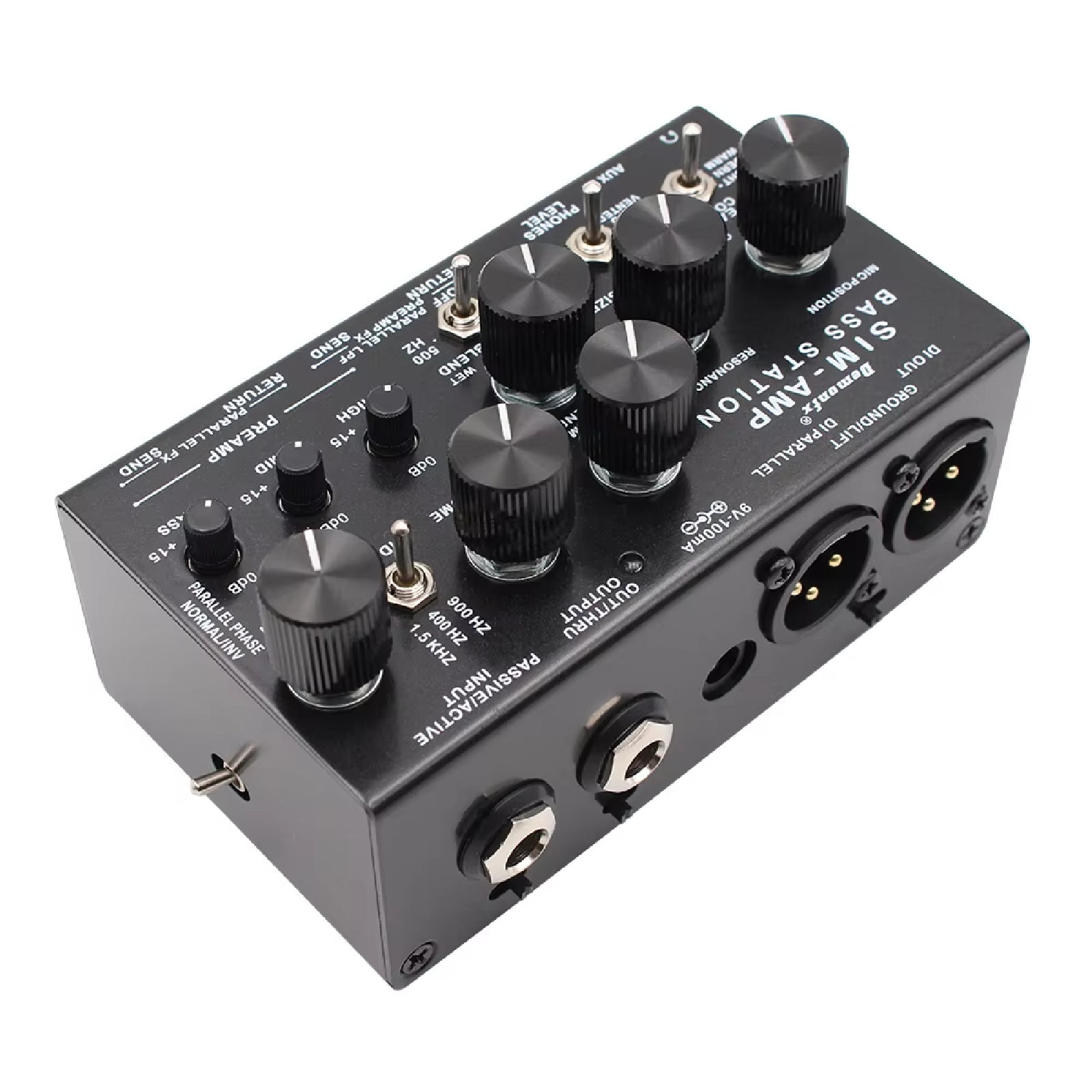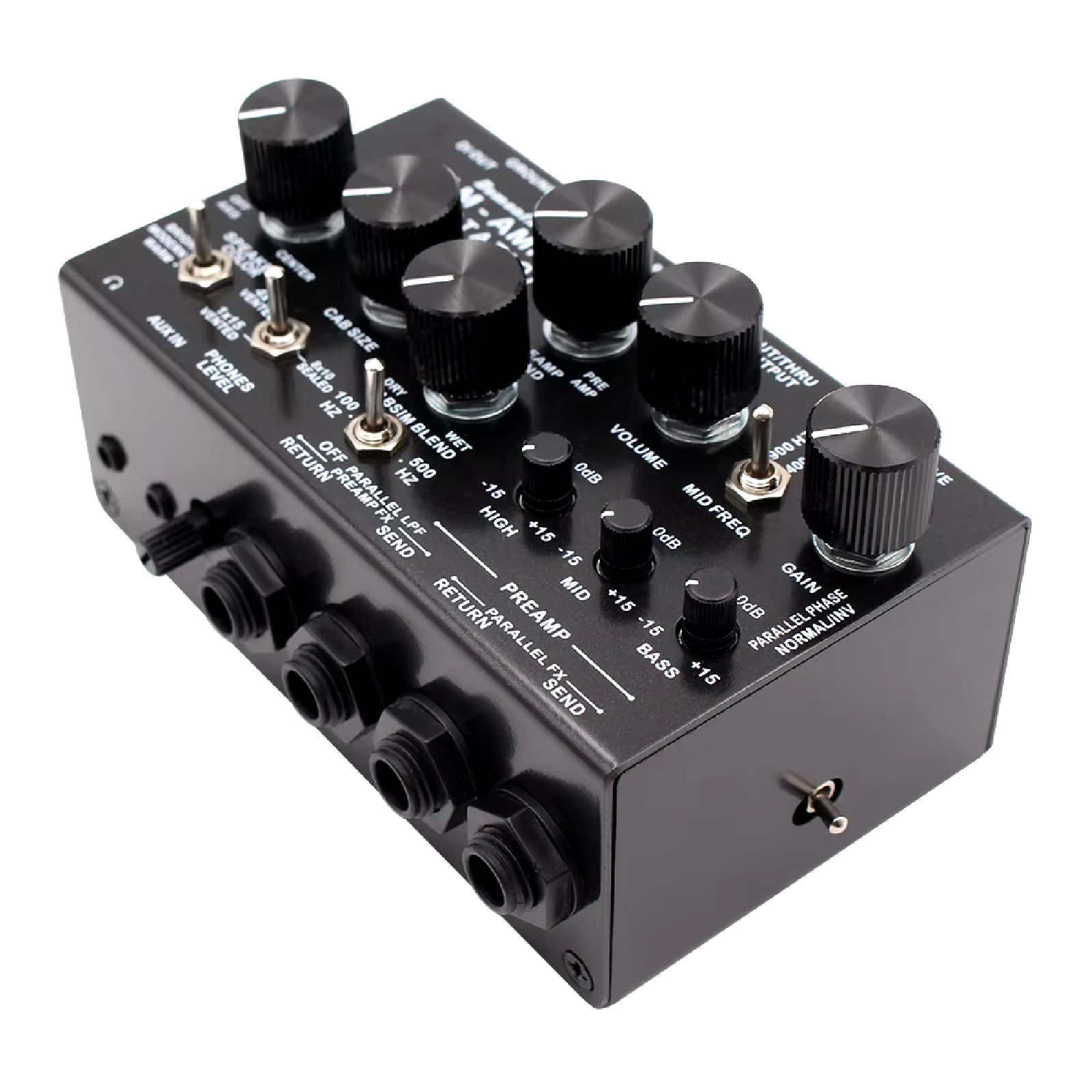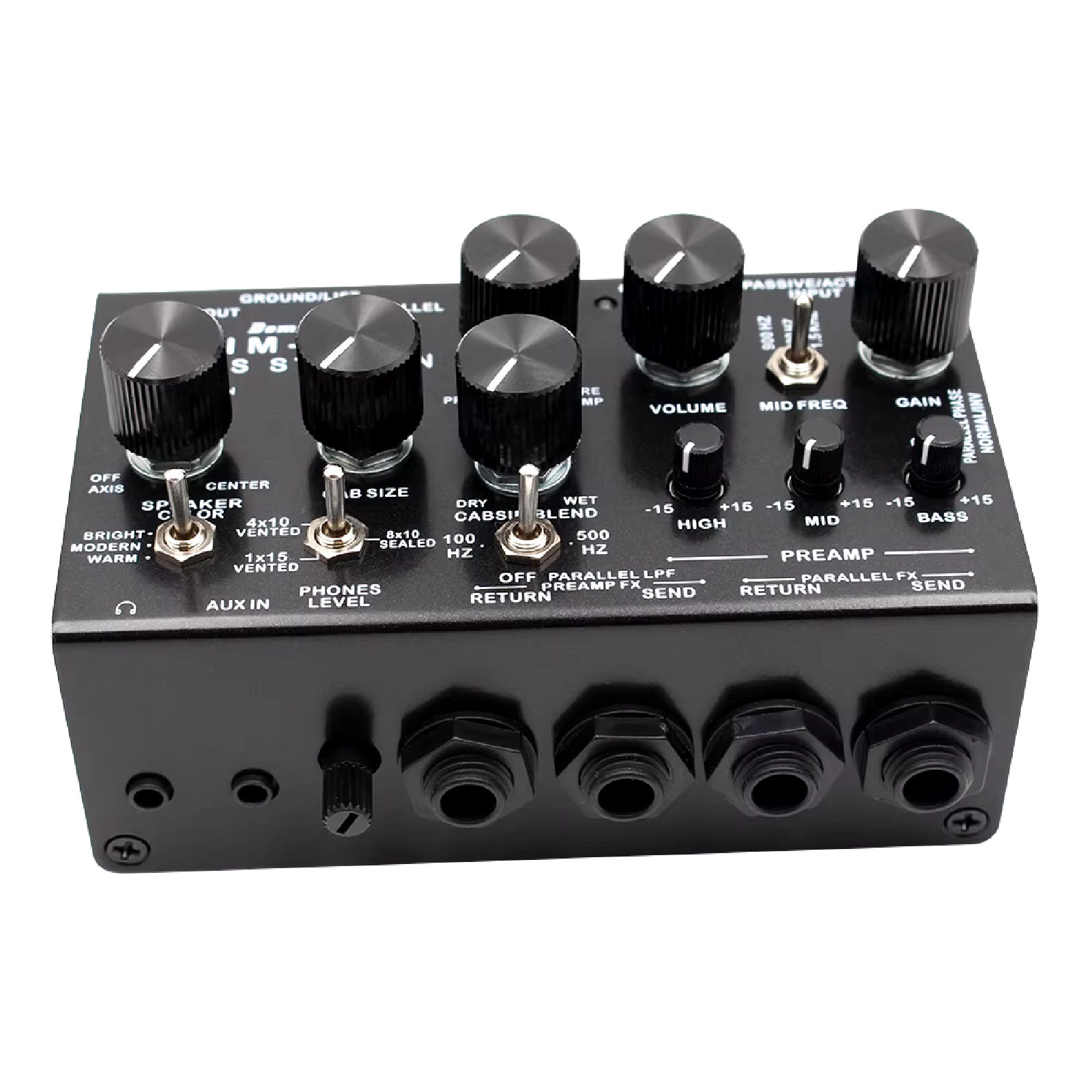 It includes a Bass Preamp with gain, level, and a 3 band EQ with semi-parametric mid control. A parallel signal routing with a selectable LPF, dual FX loop (for preamp and parallel signal), and an amazing analog cabinet simulation., based on the acclaimed Omnicabsim ® by DSM Noisemaker.