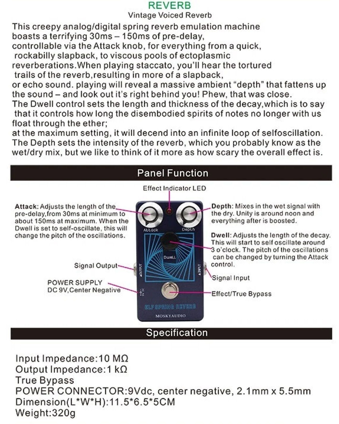 Mosky ELF Spring Reverb Vintage Voiced Reverb Guitar Pedal Attack Depth Dwell Guitar FX Pedal True Bypass