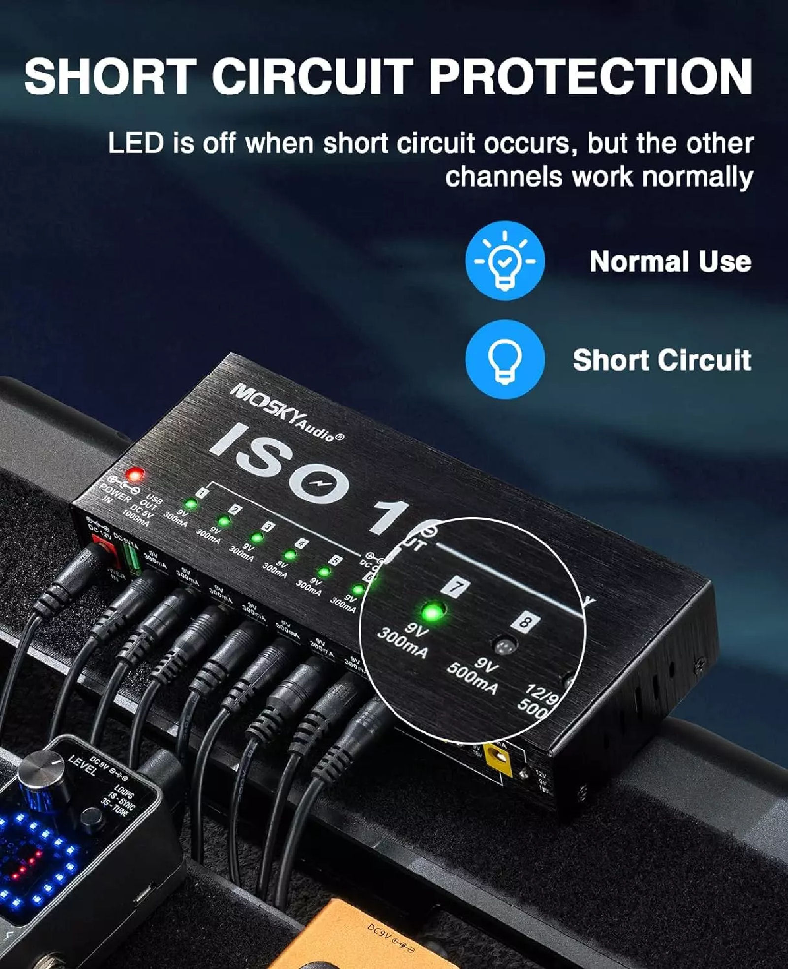 Short Circuit and Over Current Protection: The Mosky isolated pedal power supply with 10 independent output, and each channel has separate short-circuit and over-voltage protection. Short circuit in one port will not affect other ports’ normal work