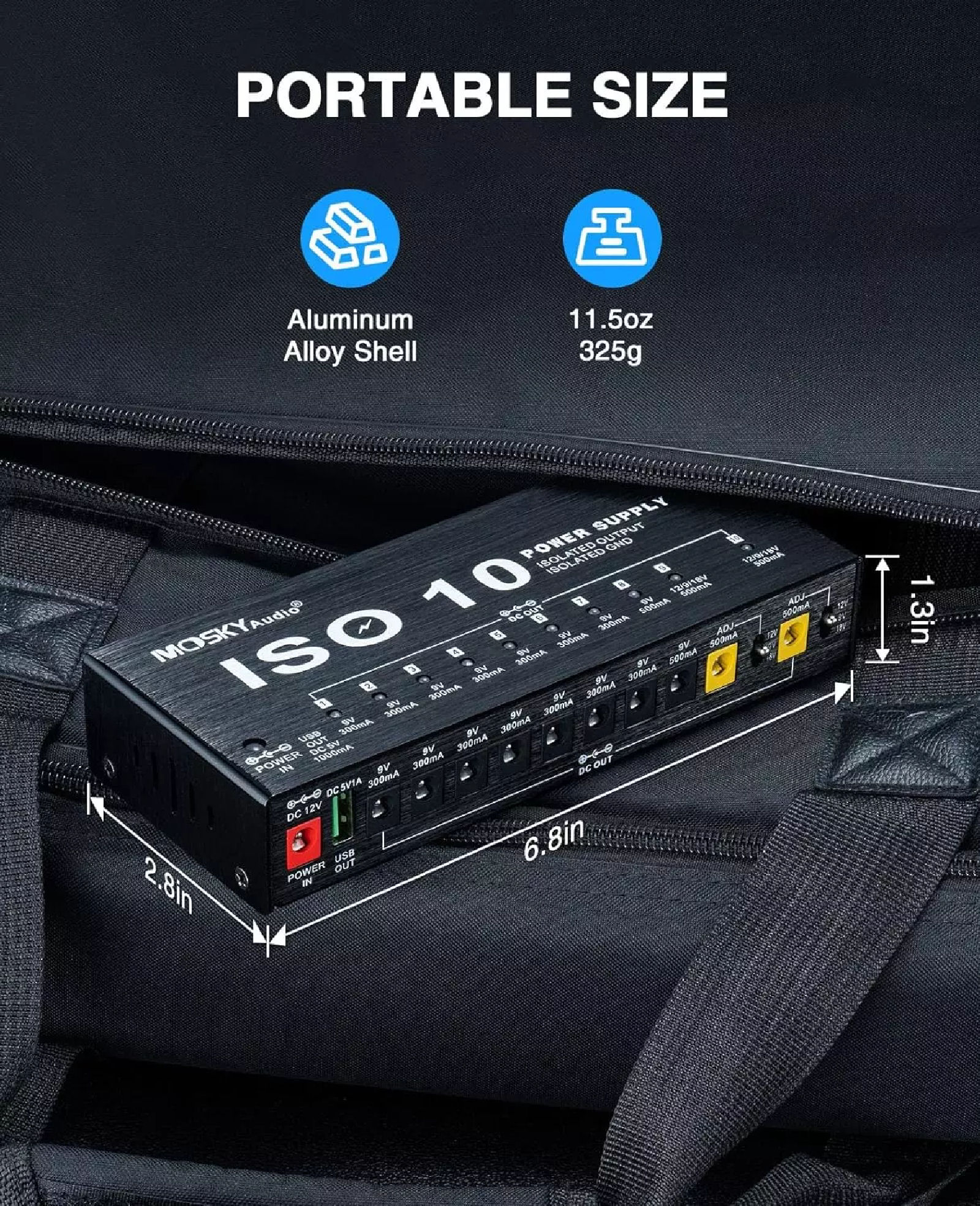 Adjustable Voltage: 10 isolated ports, plus a polarity-reversing adapter, we set up two special outputs being switchable between DC 9V, 12V, and 18V at 500mA, fit for different guitar pedals. Mosky ISO 10 Power Supply is portable and robust built