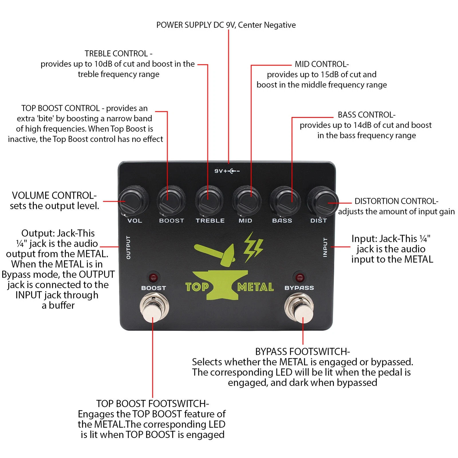 Precision Three-Band EQ Control: The BOOST TOP METAL effects pedal features a unique three-frequency EQ that allows for precise adjustments, sculpting the mid-range to create powerful heavy metal core tones essential for electric guitar performance.